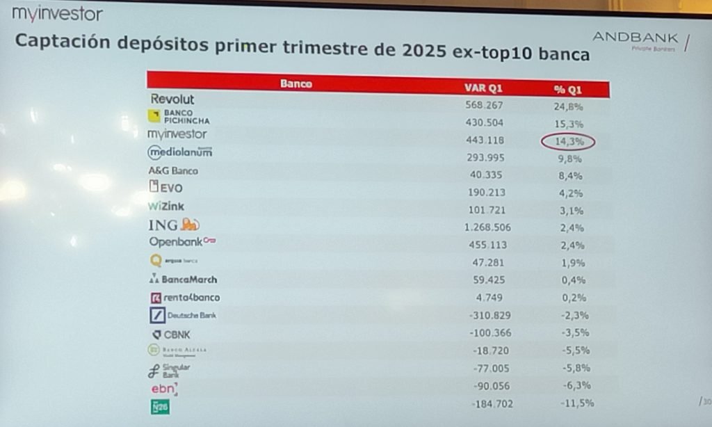 Hay otro dato positivo para los neobancos. Revolut fue, en términos relativos, la entidad española que más incrementó sus depósitos (+25%) en el primer trimestre de 2025, con datos del Banco de España. MyInvestor, cuyo vicepresidente, Carlos Aso, expuso esta clasificación ante periodistas económicos reunidos en Santander, fue el tercero, con un crecimiento del 14%.