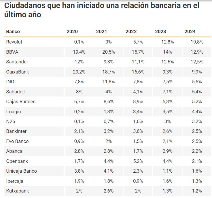 El informe de la CNMC para autorizar la OPA del BBVA sobre el Sabadell admite, con datos de Inmark de 2024, que Revolut es la entidad que más clientes nuevos atrapa (el 19,8% del total) y que el alemán N26 (3,2% del total) supera a Bankinter, Abanca, Unicaja o Ibercaja. Además, la cuota de mercado de los neobancos habría ascendido desde el 18% en 2019 hasta el 29% actual.