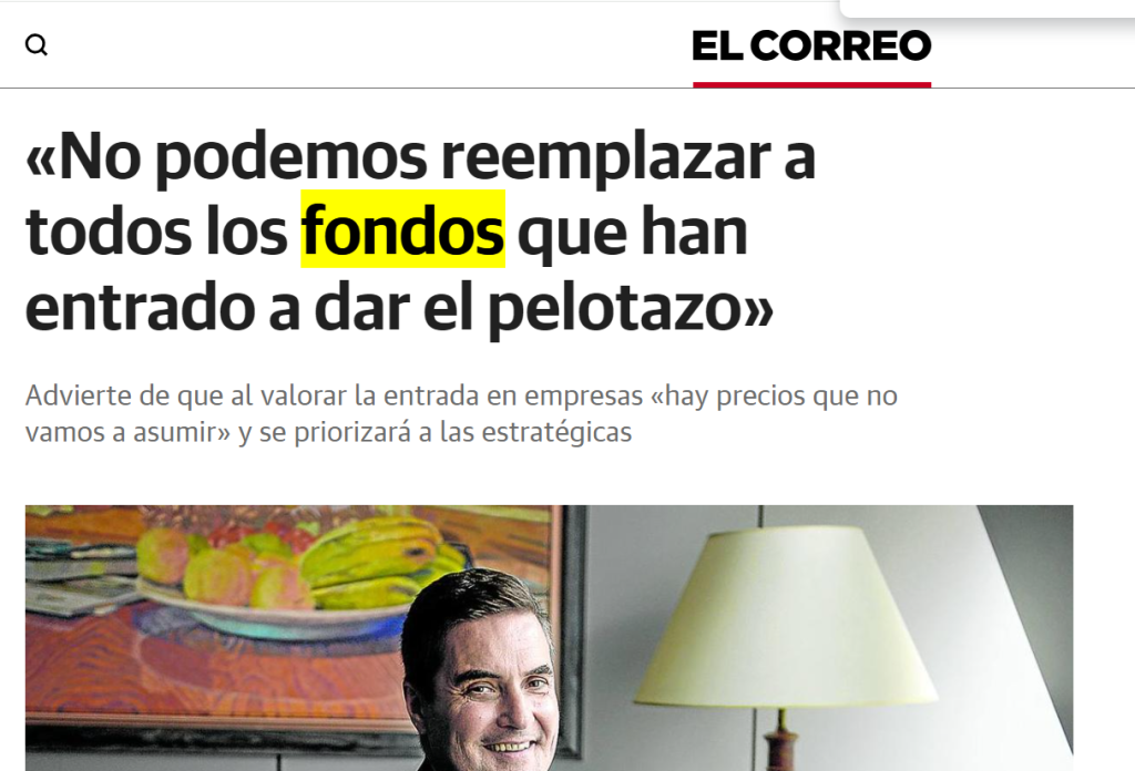 Por si fuera poco, en la entrevista Jauregi no ahorra calificativos para referirse a este tipo de sociedades de inversión. Les acusa de querer «pegar pelotazos», de llenar las empresa en las que entran «de deudas» y de dejarlas «a rastras». Luego, sin embargo, dice llevarse bien con Bain, el fondo que controla ITP, una de las compañías que mejores proyecciones tienen actualmente en Euskadi.